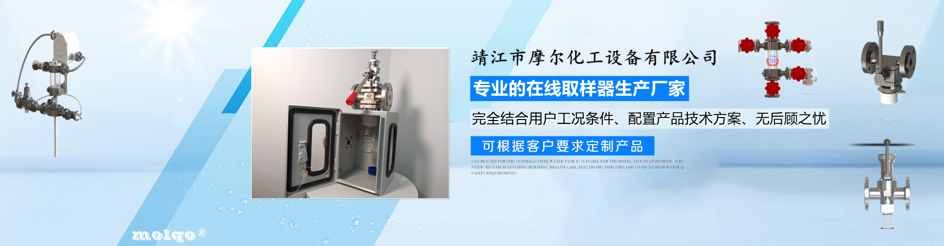 靖江市摩爾化工設(shè)備有限公司位于蘇中明珠——江蘇省靖江市城南工業(yè)園區(qū)東進路北側(cè)天元艾爾瑞內(nèi),另有生產(chǎn)基地位于靖江市經(jīng)濟技術(shù)開發(fā)區(qū)新號路1號鼎電科技園內(nèi)。我公司由數(shù)名長期從事化工生產(chǎn)、氟塑襯里模具開發(fā)以及機械自控設(shè)備的專業(yè)人員共同合作成立,致力于提供客戶最優(yōu)的高效在線取樣、反應(yīng)及精餾分離設(shè)備,為客戶提供合理的設(shè)備選型方案,以幫助客戶提高綜合生產(chǎn)效率以及改善生產(chǎn)現(xiàn)場環(huán)境為目標。 本公司主要制造及銷售的產(chǎn)品有:釜用在線取樣裝置,管道取樣閥,釜用清洗噴淋裝置、搪玻璃設(shè)備、GMP專用搪玻璃設(shè)備、氟塑襯里設(shè)備、攪拌器、釜用機械密封、氣動閥門及搪玻璃管道、襯氟閥門管道、非標不銹鋼容器,精餾塔塔器、片式冷凝器及PTFE密封件、鋯、鈦、鉭、鎳等加工件制品。我司是一家集研發(fā)銷售、設(shè)計咨詢服務(wù)于一體的專業(yè)···